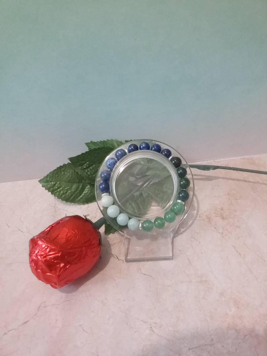 Bracelet composé de 4 perles d'amazonite naturelle, 4 perles de lapis-lazuli naturel, 4 perles d'agate mousse naturelle, 4 perles de sodalite naturelle, 4 perles d'aventurine verte, 5 séparateurs en alliage métallique, fil élastique