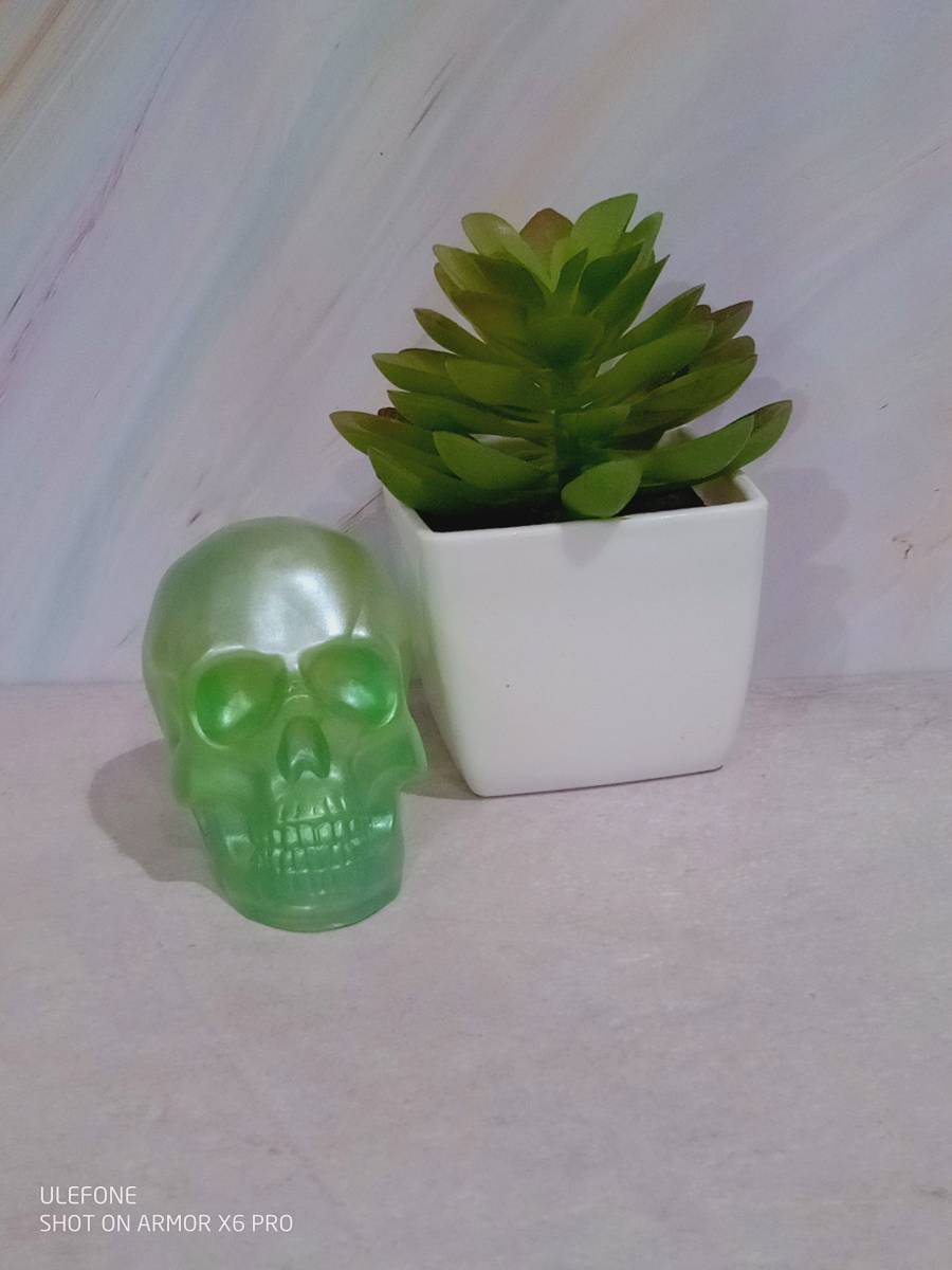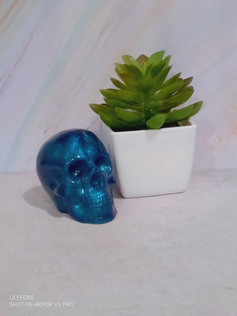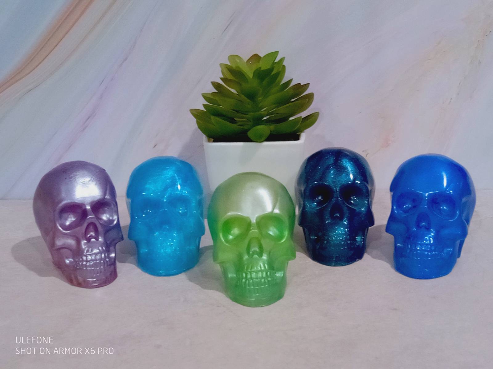 Crânes en taille M (moyenne), deux types différents : résine mélangée aux pigments ou moule peint avec les pigments et résine coulée après.
