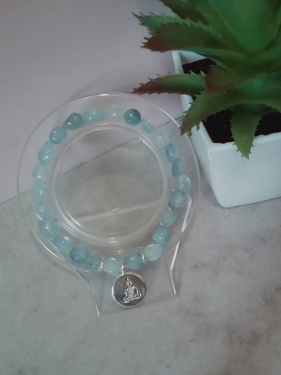 Bracelet composé de 24 perles galets d'aigue-marine naturelle, de 2 séparateurs ronds plats en alliage métallique, d'un pendentif en acier inoxydable et d'un fil élastique de 0,8mm