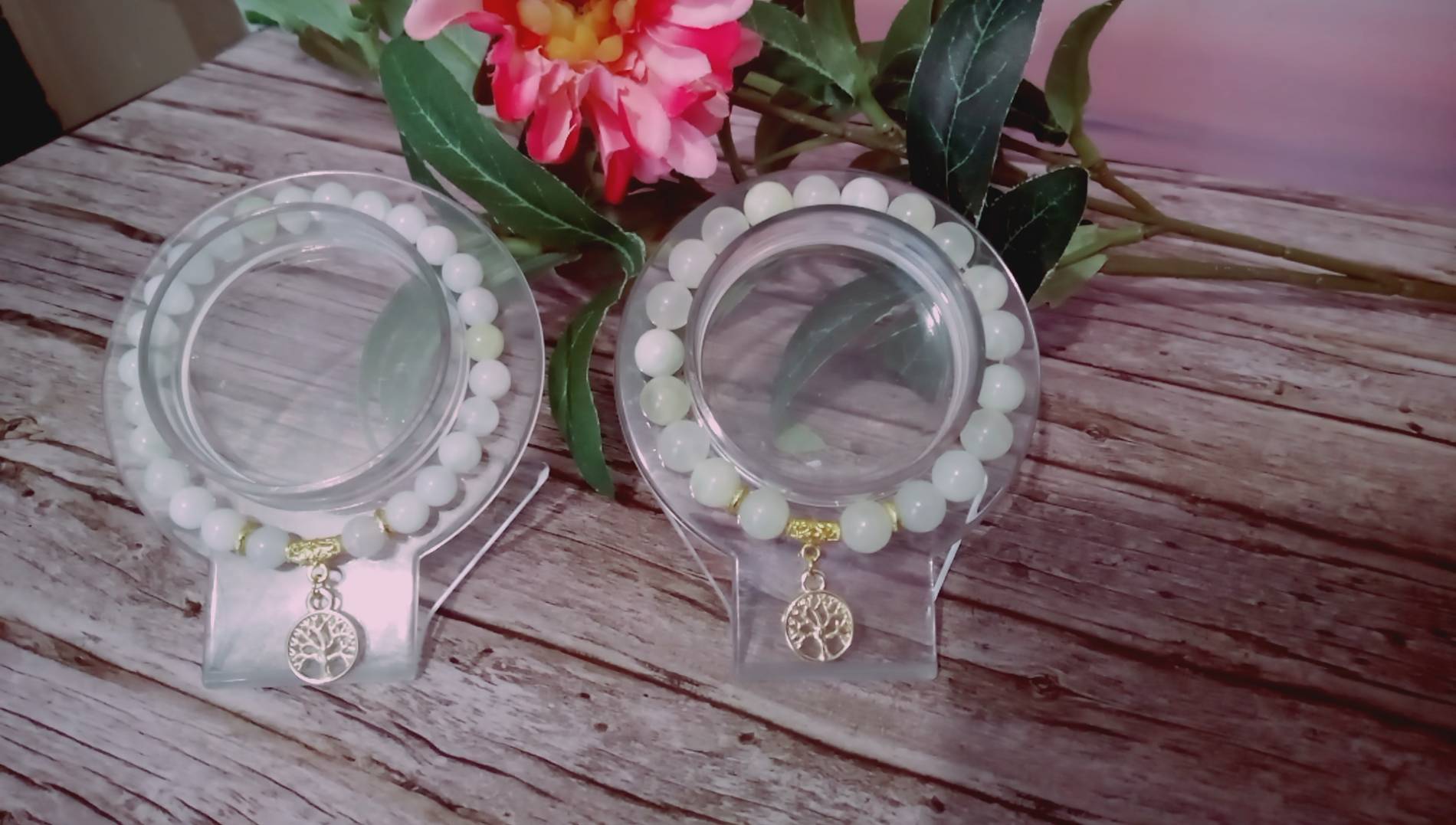 Composé de 20 perles de Jade Chinois, de 2 séparateurs ronds plats en alliage métallique doré, d'un séparateur avec pendentif en alliage métallique (aléatoire) et d'un fil élastique de 0,8mm
