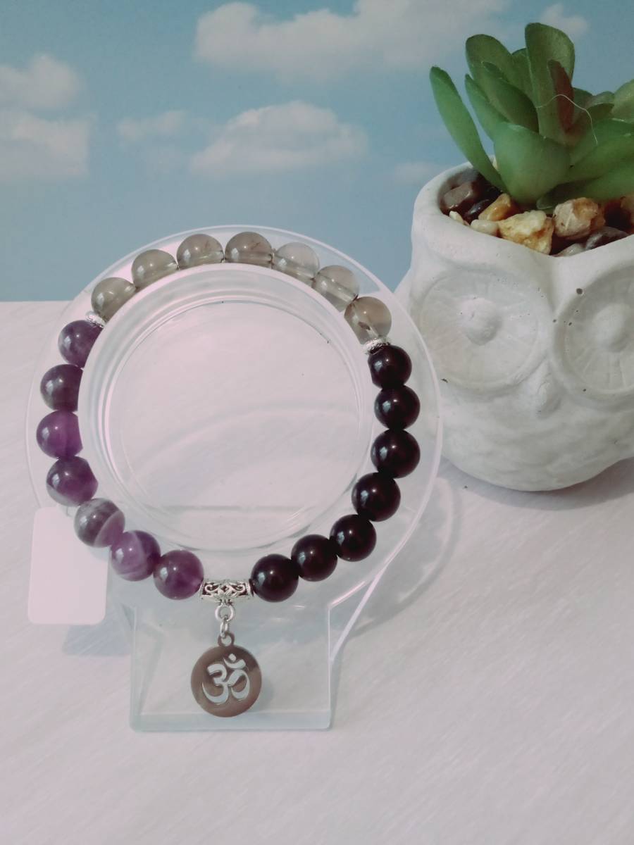Bracelet en 8 mm composé de 7 perles d'obsidienne noire naturelle, de 7 perles de quartz fumé naturel, de 7 perles d'améthyste naturelle, de 2 séparateurs ronds plats en alliage métallique, d'un pendentif en acier inoxydable et d'un fil élastique de 0,8mm