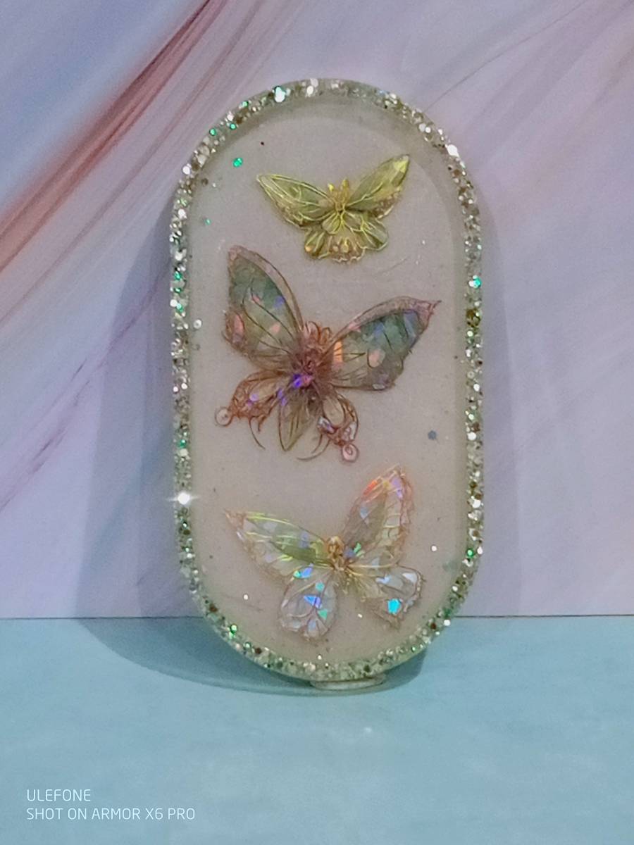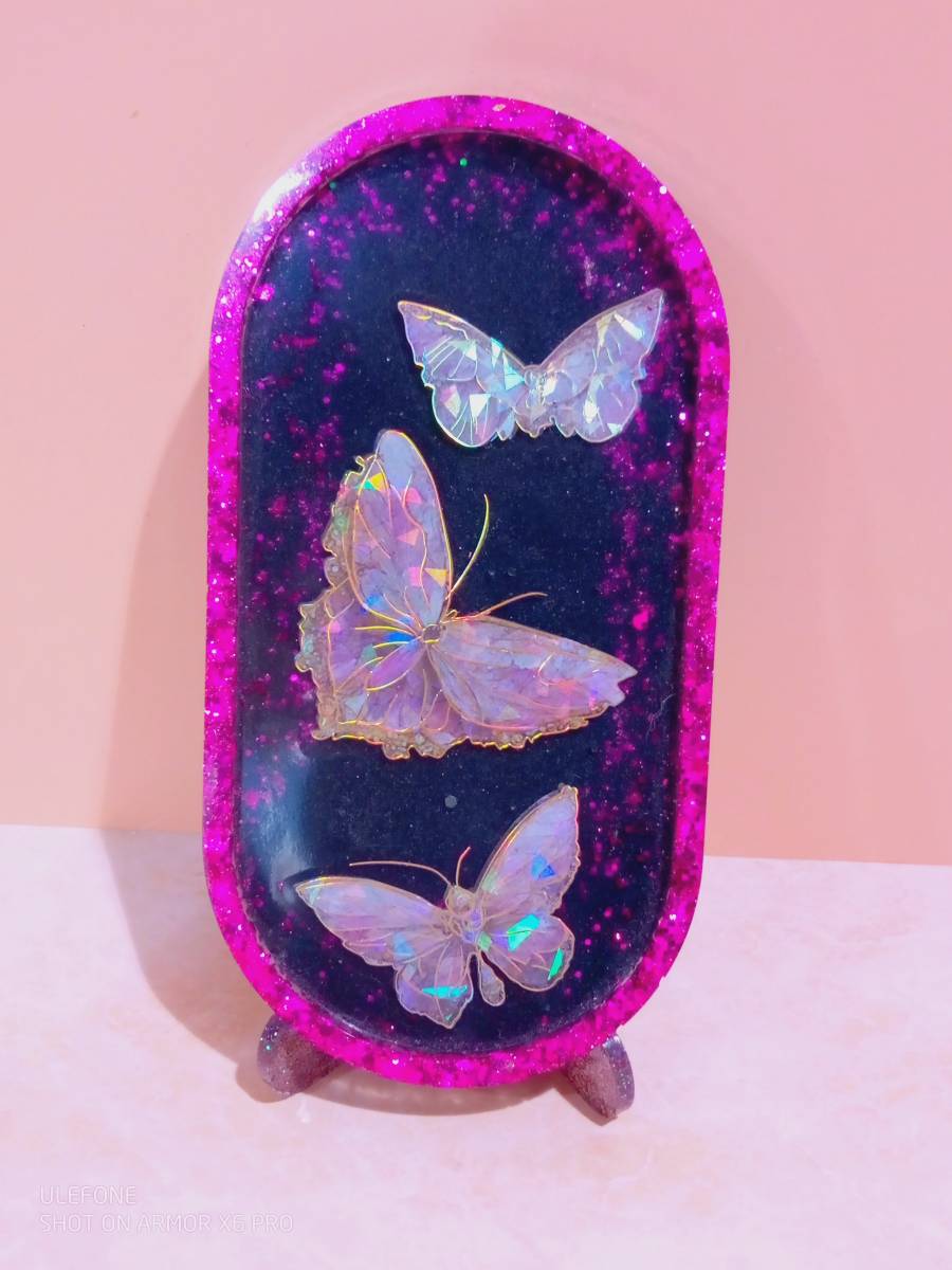 Résine epoxyfood, poudre mica, sticker papillon, paillettes