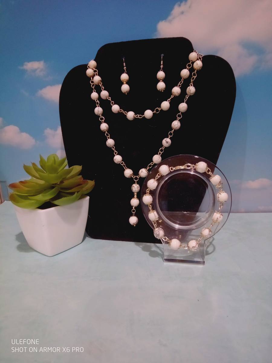 Howlite blanche, ornement, anneaux, fermoir et tiges en acier inoxydable