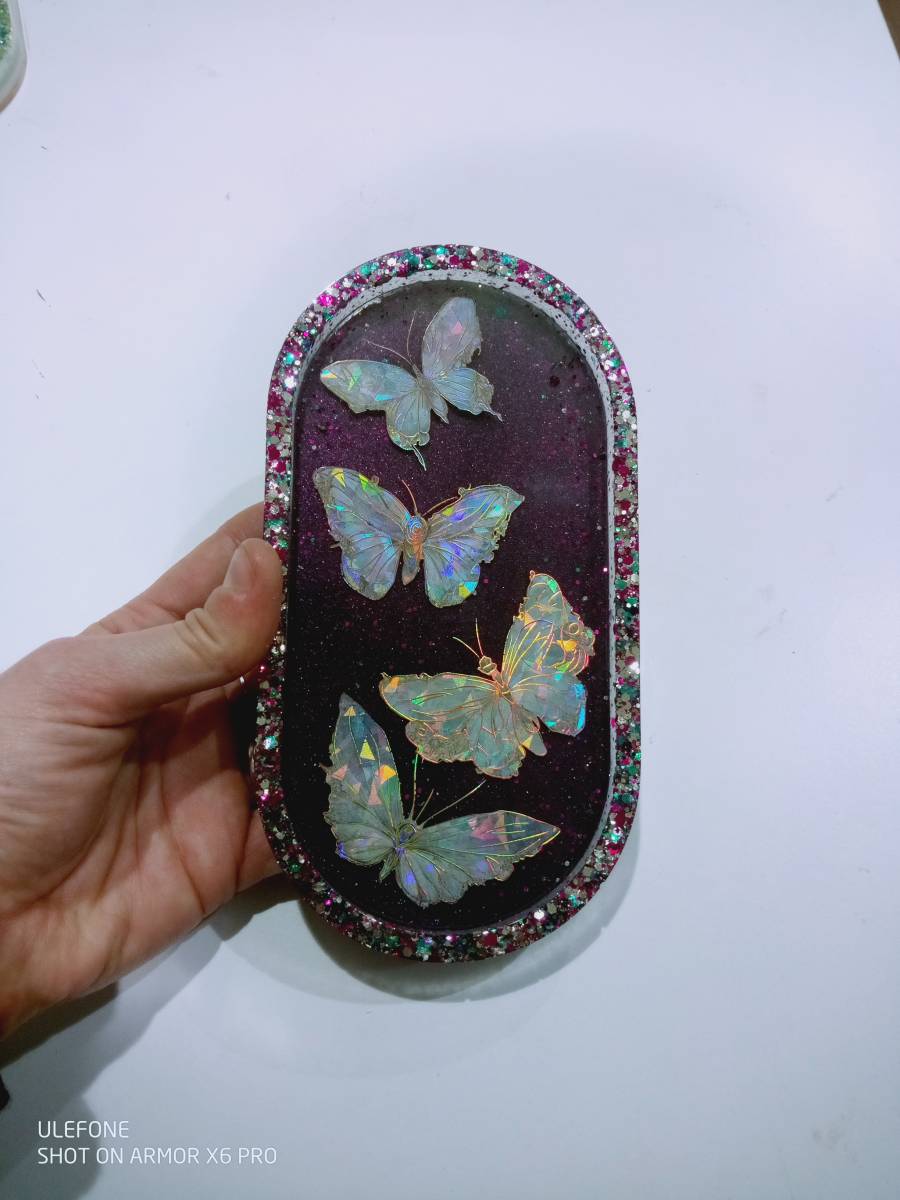Résine epoxyfood, poudre mica, sticker papillon, paillettes