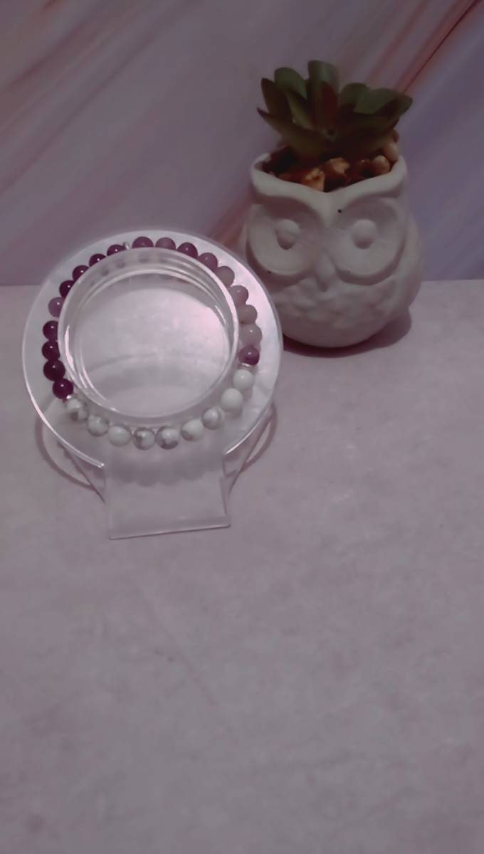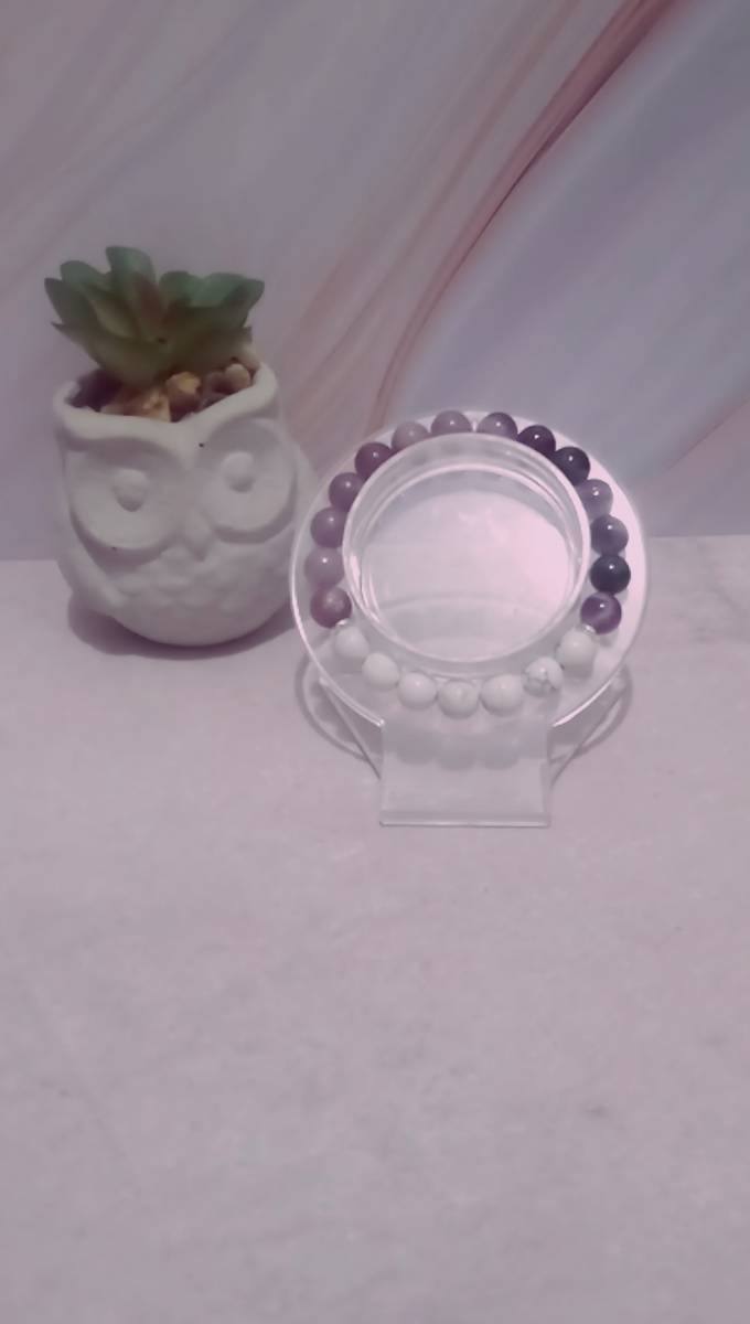 Bracelet en 8 mm composé de 7 perles de howlite naturelle, de 7 perles de lépidolite naturelle, de 7 perles d'améthyste naturelle, de 3 séparateurs en alliage métallique et d'un fil élastique de 0,8mm